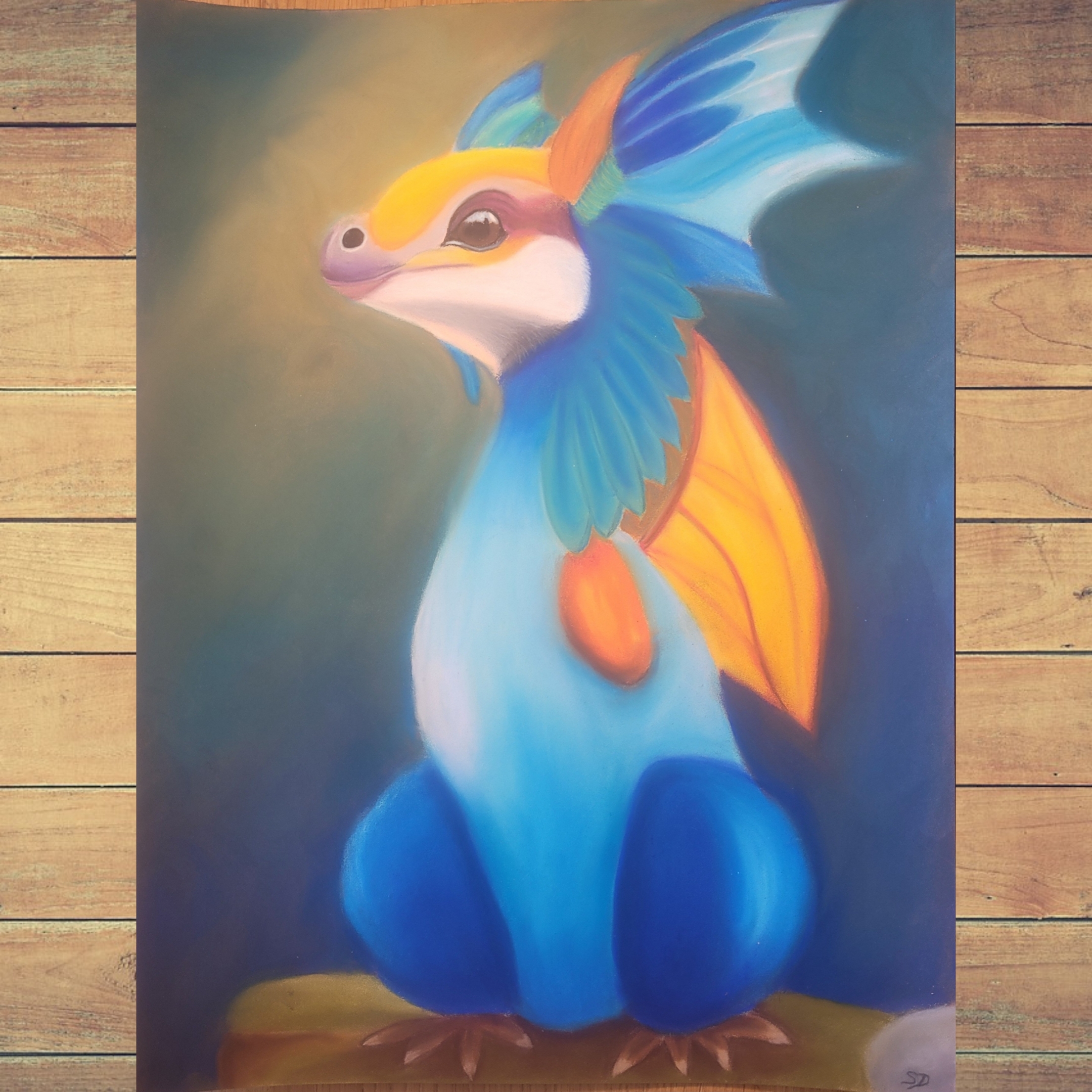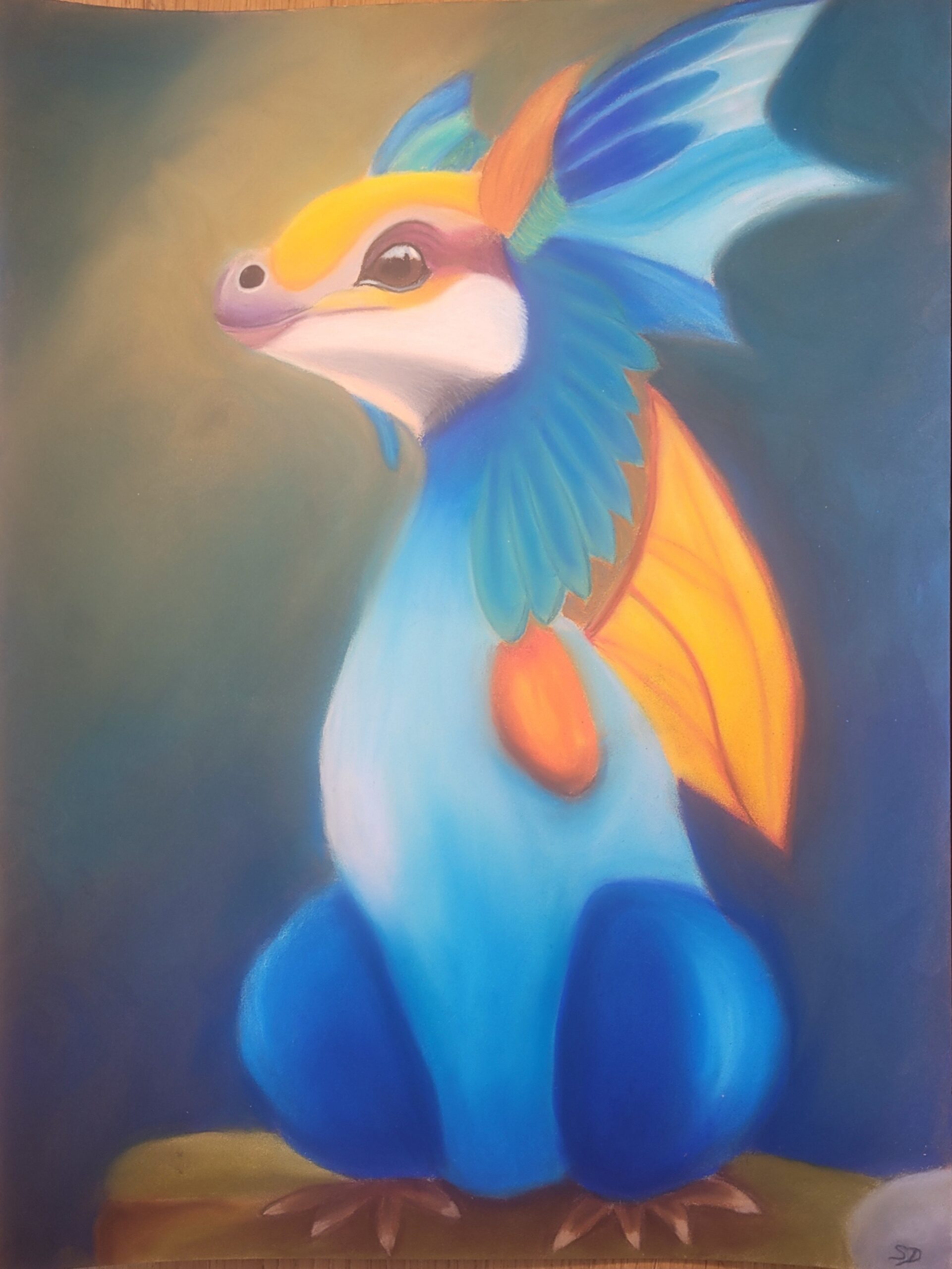 Le Gardien veille avec une présence bienveillante. Réalisé aux pastels secs sur papier Pastelmat, ce dessin représente un gentil dragon fantastique, enveloppé de lueurs orangées et bleues. Les teintes chaleureuses et les textures fluides des pastels évoquent une aura protectrice et majestueuse.