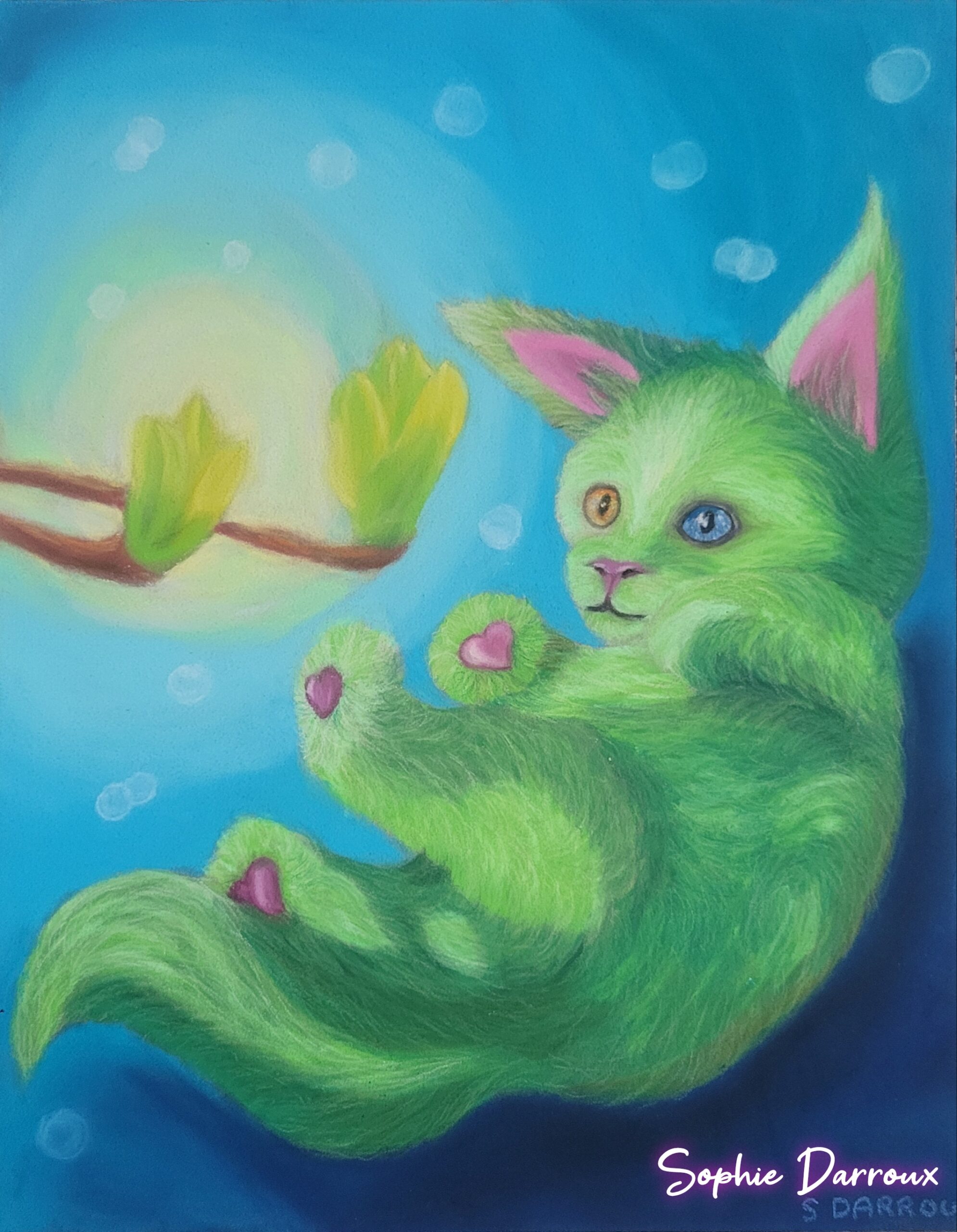 Lévitation capture un instant de grâce aérienne. Réalisé aux pastels secs sur papier Pastelmat, ce dessin représente un chat fantastique aux poils verts, semblant flotter ou entamer une douce chute. Les teintes vibrantes et les textures fluides des pastels évoquent un mouvement léger et onirique.