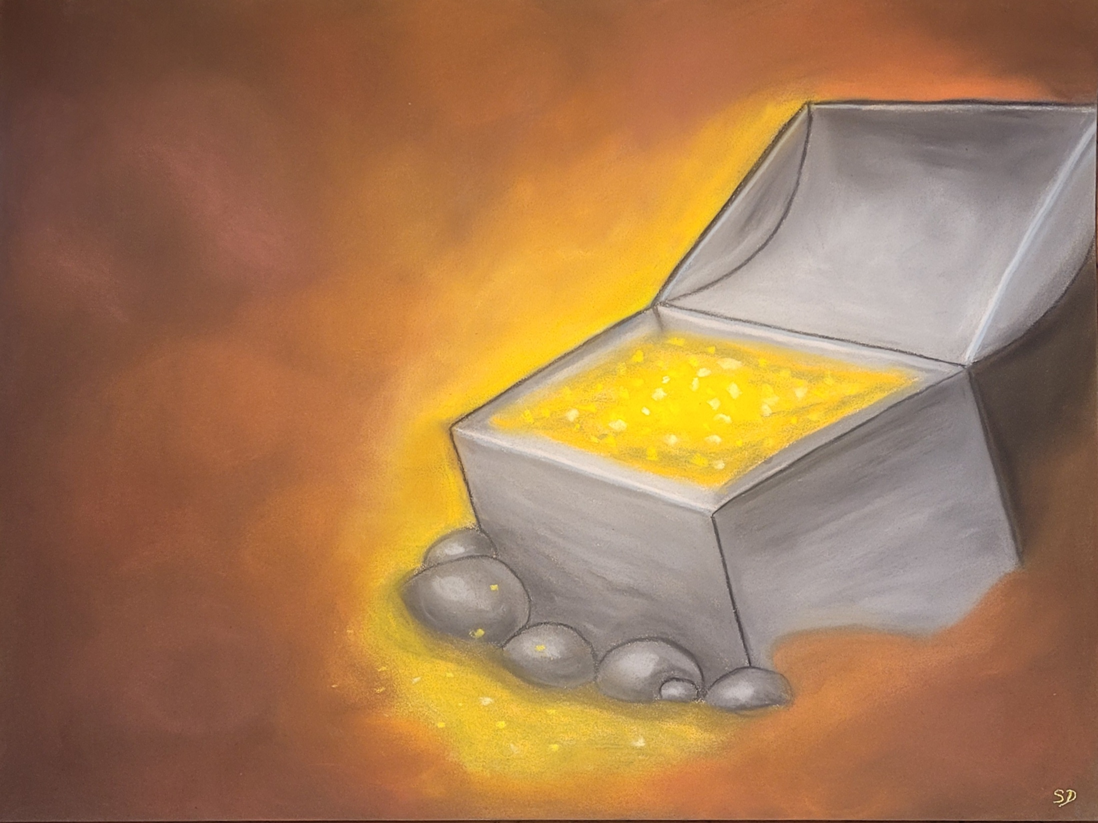 Trésor Intérieur révèle une lumière cachée au cœur de l’âme. Réalisé aux pastels secs sur papier Pastelmat, ce dessin représente un trésor gris ouvert, rayonnant d’une lueur dorée intense, sur un fond orangé chaleureux. Les textures riches et les teintes vibrantes des pastels évoquent une découverte intime et lumineuse.
